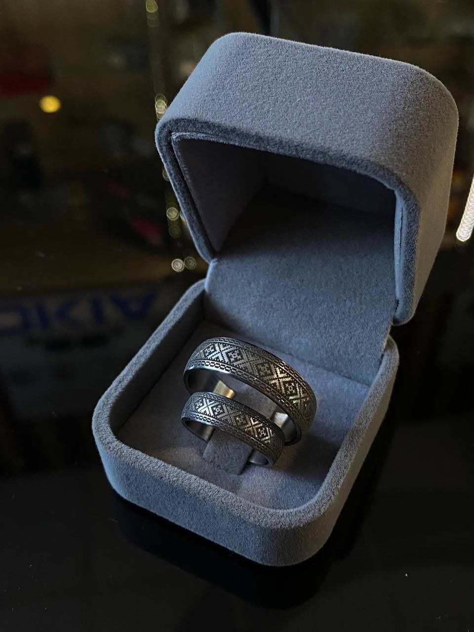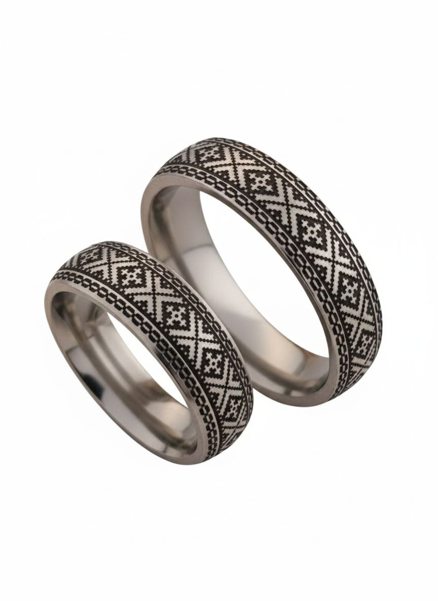 Ця парна або обручальна каблучка виготовлена з високотехнологічного титану — металу, що цінується за його надзвичайну міцність, легкість та повну гіпоалергенність. Холодний, сучасний блиск титану елегантно контрастує з глибоким чорним гравіюванням, яке створює ефект стародавньої, витонченої вишивки, нанесеної по всьому колу каблучки.